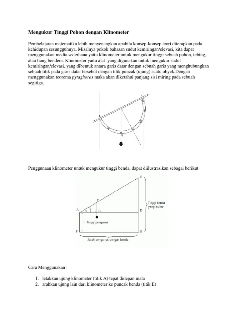 Ketinggian hp pada saat melakukan pengukuran harus tentukan terlebih dahulu sebagai patokan awal. Puncak pohon dengan sudut elevasi 6 0 derajat. Dengan cara inilah saya dapat mengetahui tinggi objek tertentu dengan menggunakan rumus trigonometri. Menaksir tinggi menaksir tinggi digunakan untuk memperkirakan tinggi suatu objek, misal seperti pohon, tiang bendera, ataupun gedung. Kecepatan konstan itulah yang berlaku dalam fungsi linear.